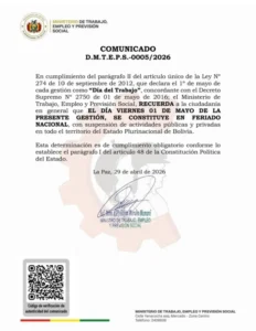 El Ministerio de Trabajo, Empleo y Previsión Social confirmó que el viernes 1 de mayo se constituye en feriado nacional en todo el territorio boliviano, en conmemoración del Día del Trabajo.