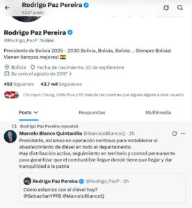 En un acto poco usual, el presidente Rodrigo Paz pidió de forma virtual, a través de la red social X, un informe al ministro de Hidrocarburos, Marcelo Blanco, y al presidente de Yacimientos Petrolíferos Fiscales Bolivianos (YPFB), Sebastián Daroca, sobre las acciones para resolver la escasez de diésel.